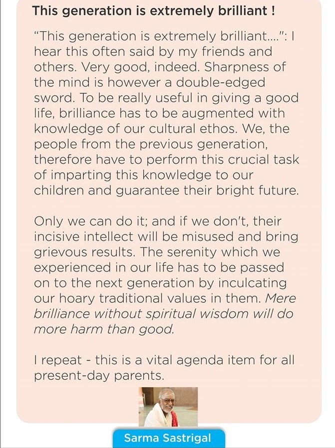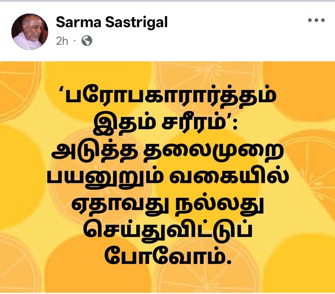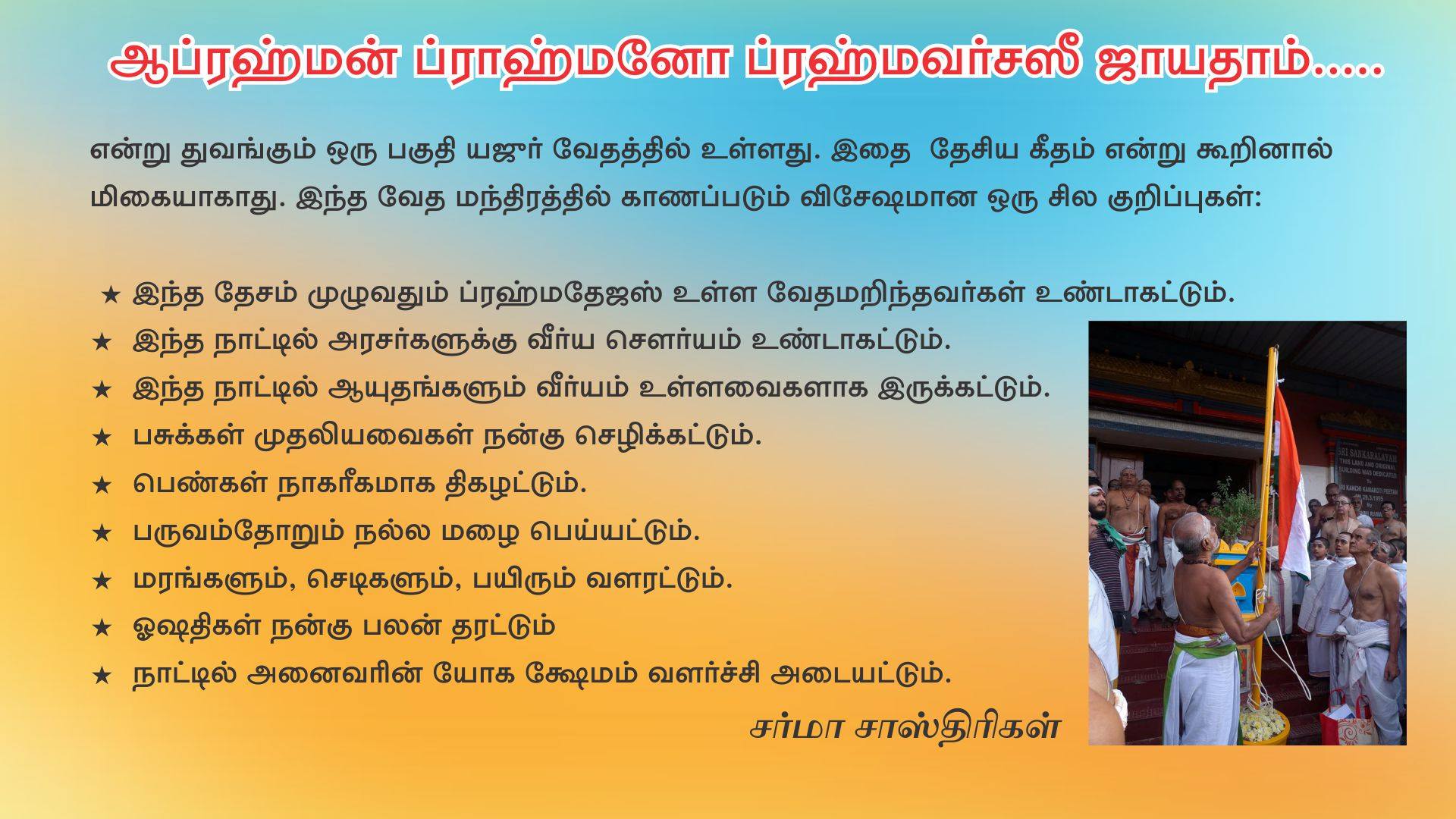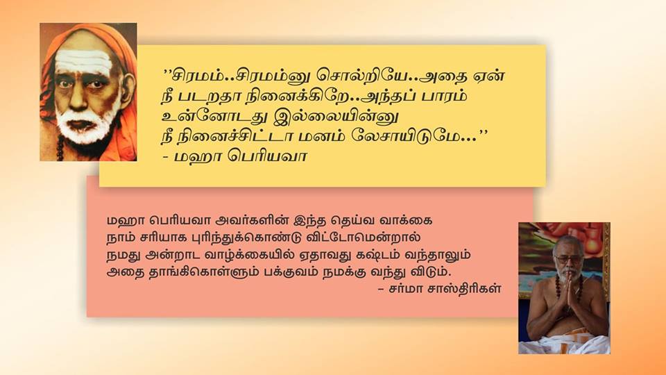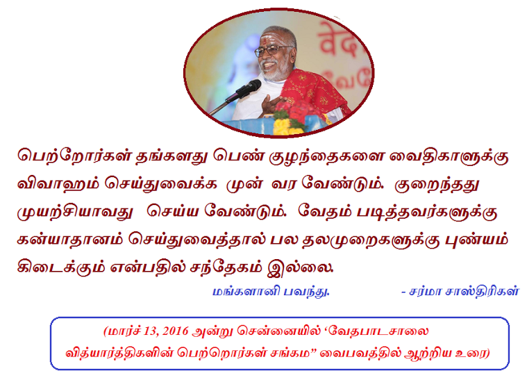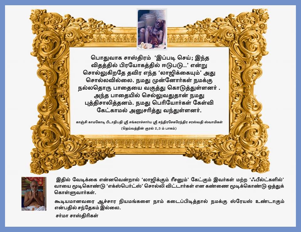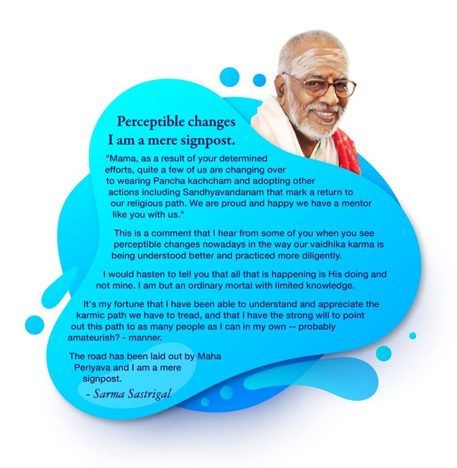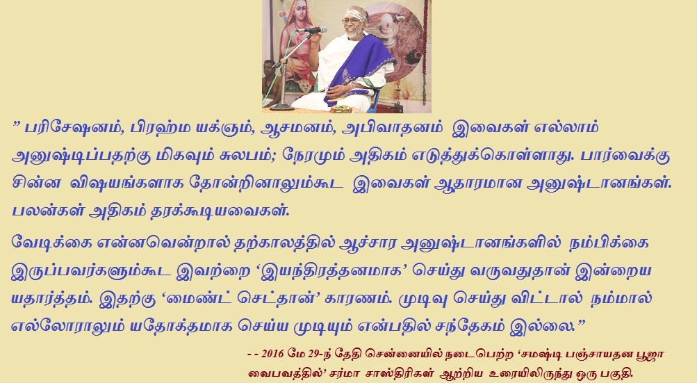 விட்டுப் போன நல்ல விஷயங்களை எல்லாவற்றையும் மீண்டும் ஞாபகப்படுத்தனும், பிரசாரப்படுத்தனும். இம்மாதிரியான நல்ல நிகழ்ச்சிகள் தொடர்ந்து நடப்பது அவசியம்.’ – காஞ்சி காமகோடி பீடாதிபதி பூஜ்யஶ்ரீ ஜகத்குரு சங்கராச்சாரிய ஸ்வாமிகள்.