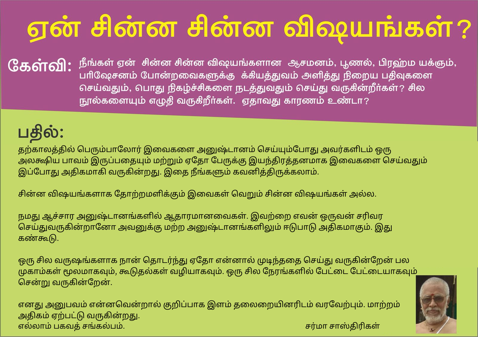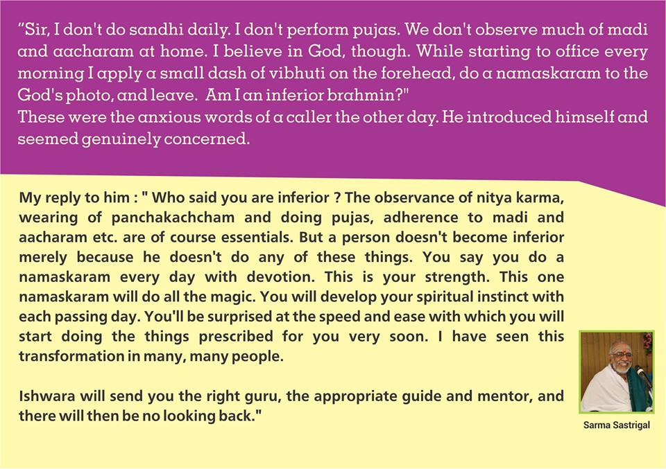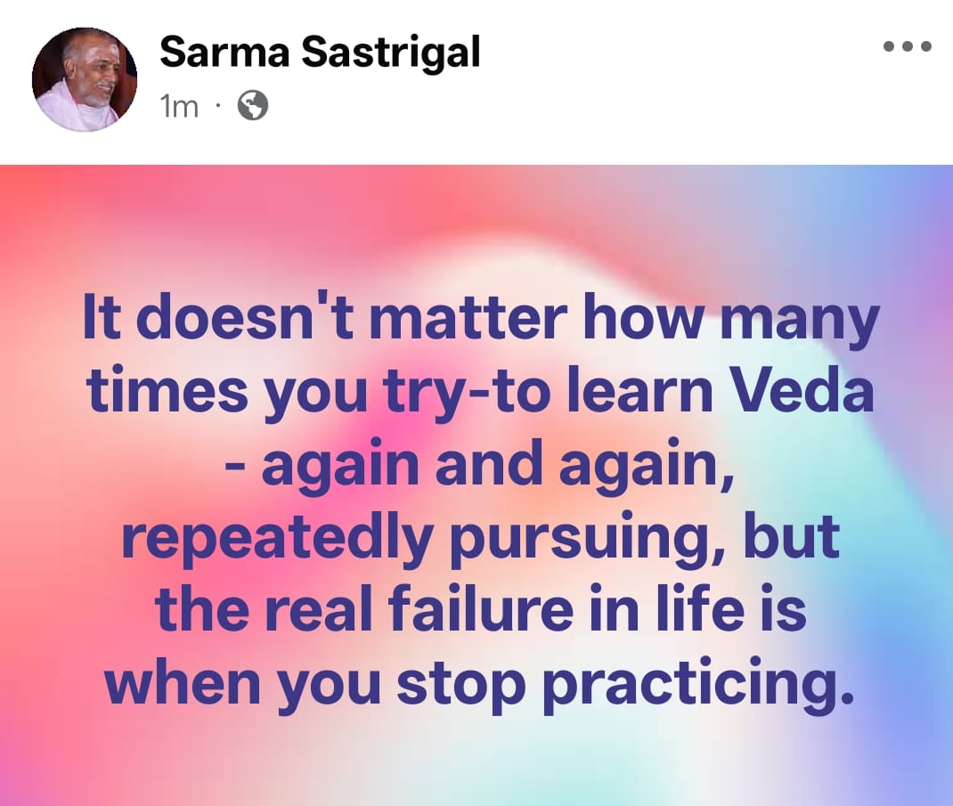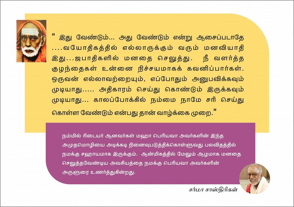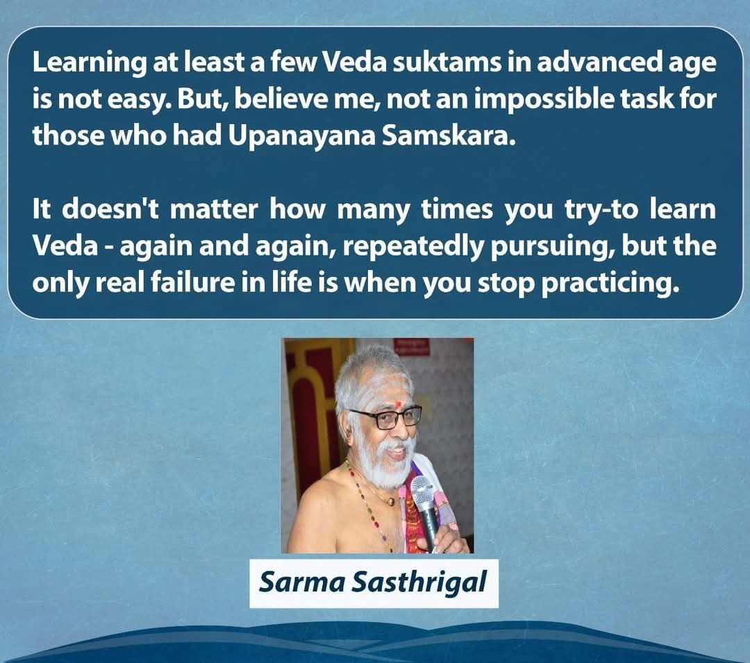 ’ரிடைர் ஆன பிறகு எந்த இலக்கும் இல்லாமல். இருக்கிறேனே’ என்று கவலைப்படுபவர்களில் நீங்களும் ஒருவரா? கவலைப்பட வேண்டாம். குருமுகமாக வேதம் கற்றுக்கொள்ள முயற்சி செய்யவும். ஜன்மமும் சாபல்யம் ஆகும்