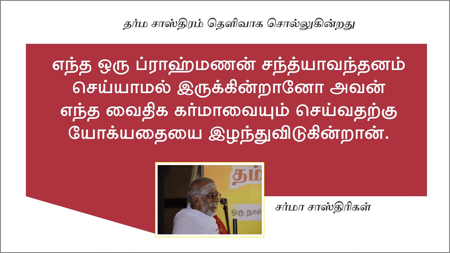 ஸந்த்யாவந்தன அனுஷ்டானத்தை எக்காலத்திலும் விட்டு விடக்கூடாது. ஆசெளச காலம் உள்பட. முன்னோர்கள் காட்டிய வழி