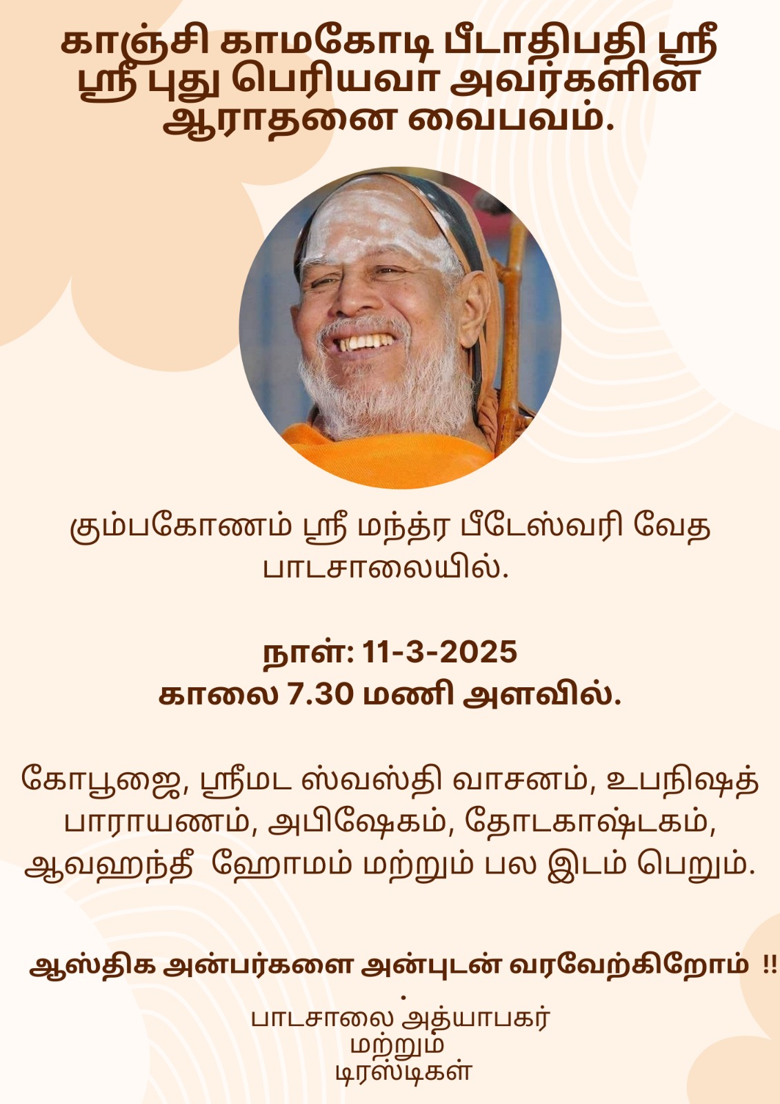 காஞ்சி காமகோடி பீடாதிபதி ஸ்ரீ ஸ்ரீ பெரியவா அவர்களின் ஆராதனை வைபவத்தை முன்னிட்டு கும்பகோணம் ஸ்ரீ மந்த்ர பீடேஸ்வரி வேத பாடசாலையில் கோபூஜை, ஸ்ரீமட ஸ்வஸ்தி வாசனம், உபநிஷத் பாராயணம், அபிஷேகம், தோடகாஷ்டகம், ஆவஹந்தீ ஹோமம் முதலியவைகள் நடைபெற்றன